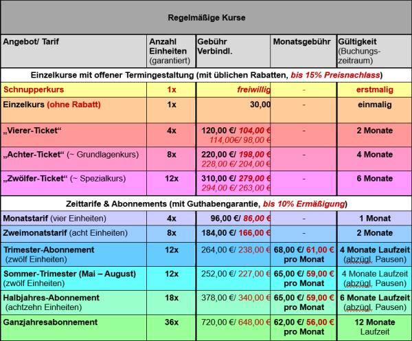 Jede "Kurs-Einheit" der hier aufgeführten Tarife umfasst 2 ½ Zeitstunden (= 3 Unterrichtsstunden zu jew. 45 min mit Pause).